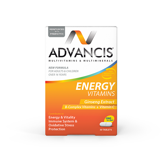 Advancis? Energy Vitamins is a food supplement designed for once-daily intake, containing vitamins, minerals, FOS (fructooligosaccharides), and GOS (galactooligosaccharides).